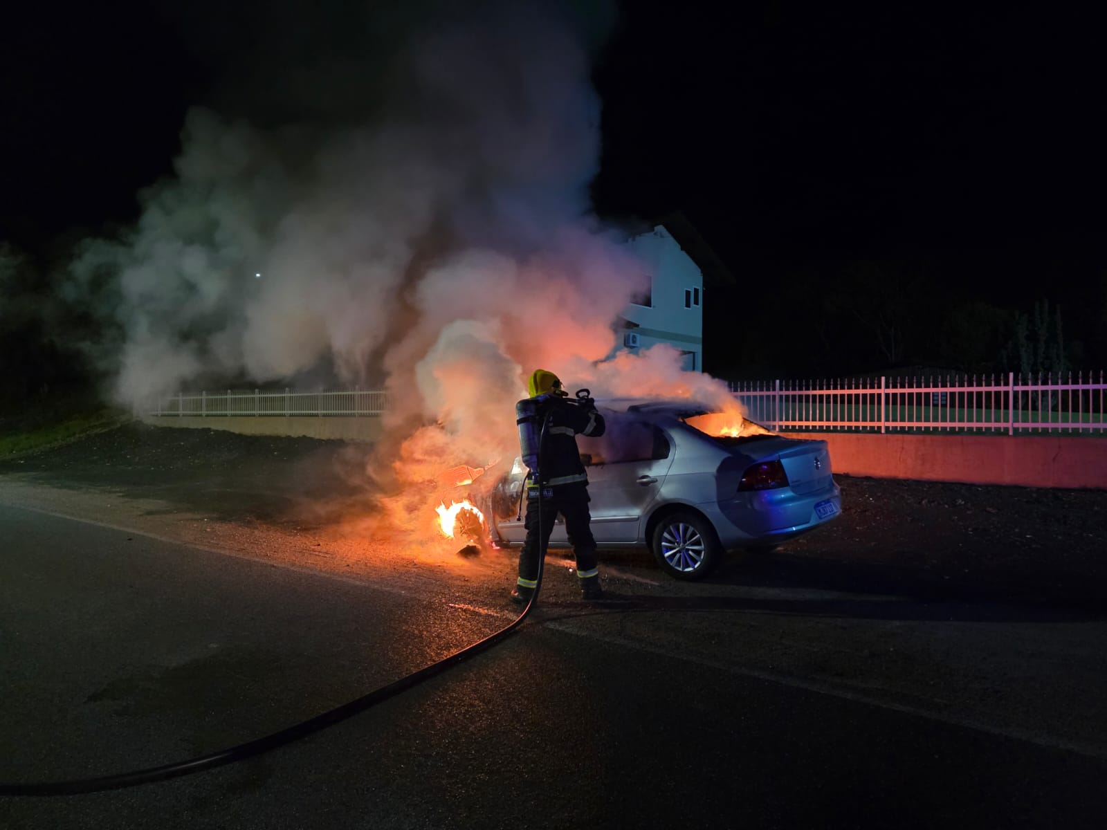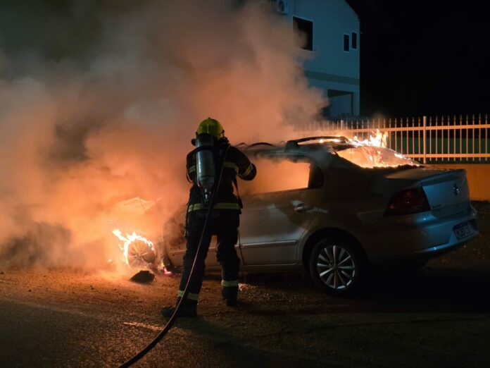 Um automóvel VW Voyage foi atingido por um incêndio em Timbó na noite desta segunda-feira (10). O fato aconteceu na Rodovia Tercílio Marchetti, bairro Das Capitais, por volta das 19h50.